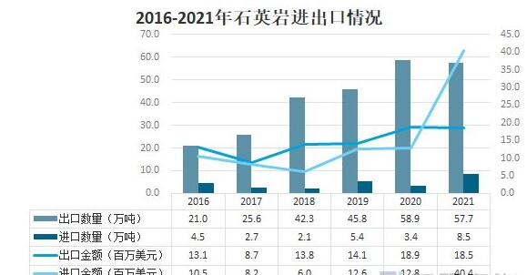 我國石英巖出口量遠超進口量,出口金額卻低于進口金額。2021年,我國出口石英巖57.7萬噸,出口金額為18.5百萬美元;進口石英巖8.5萬噸,進口金額達40.4百萬美元。