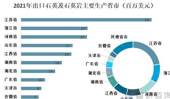 我國出口石英及石英巖首要來自江蘇省,2021年出口金額為53百萬美元,其次為浙江省和河南省,出口金額約為27百萬美元。